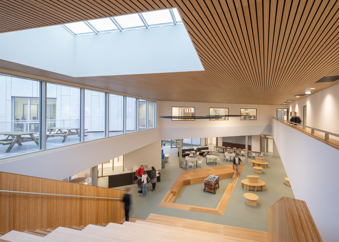 Tussen de praktijkruimten en de theorieruimten is plaats voor ontmoeting. De typische gebouwvorm zorgt ervoor dat deze ontmoetingsruimte niet uit één grote ruimte bestaat, maar heeft een aantal geborgen hoeken. Drie patio’s zorgen voor daglicht en geven leerlingen een beschutte plek om even stoom af te blazen. Dit kan natuurlijk ook op de grote buitenruimte aan de zuidzijde van het gebouw en op het kleine sportveld tussen de beide gymzalen op het dak.