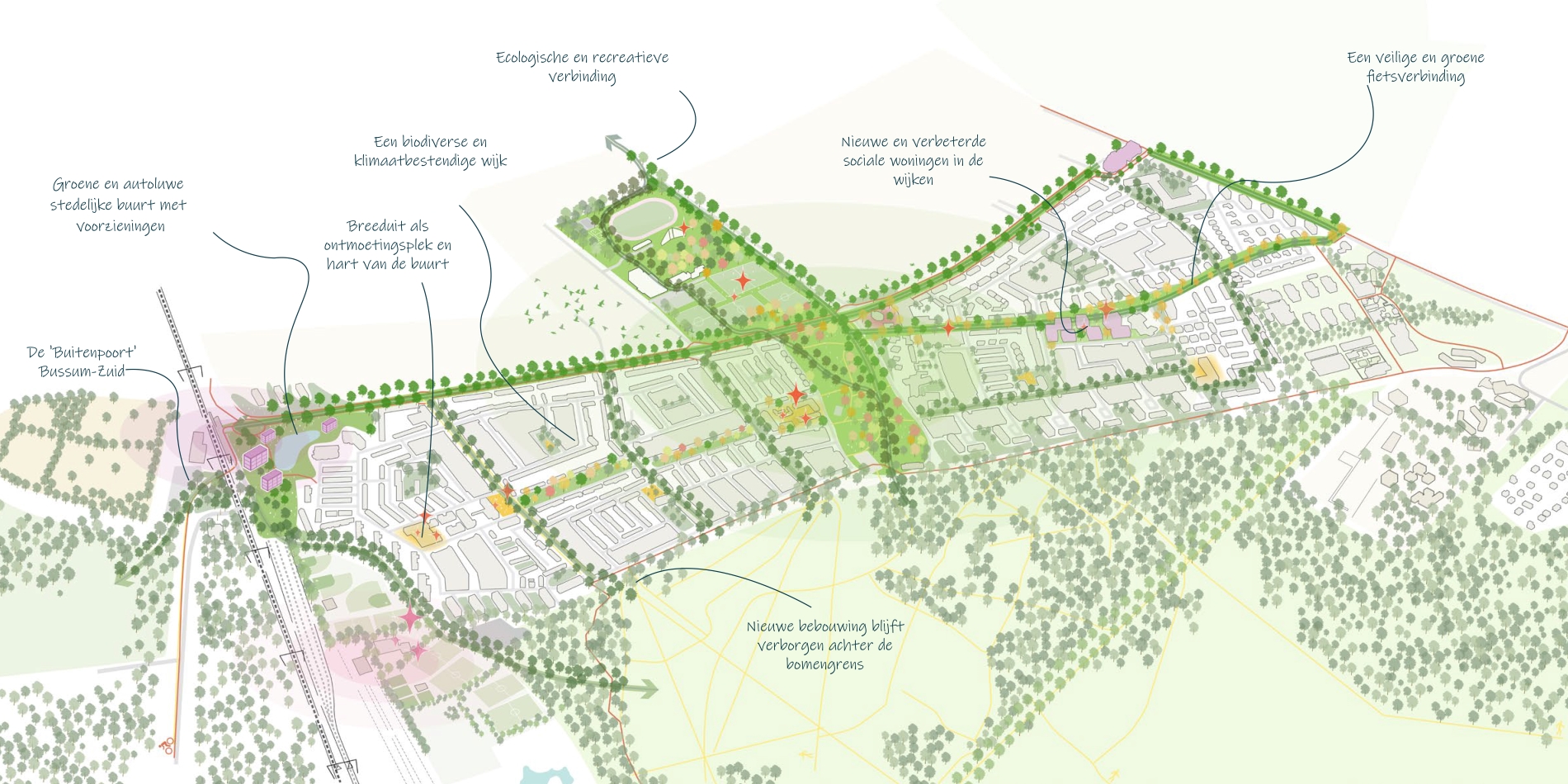 De groei van steden heeft de positie van veel naoorlogse wijken veranderd. Bedacht als rustige wijken op de overgang van stad en landschap, liggen ze nu vaak centraal tussen de vooroorlogse stad en nieuw bebouwd gebied in. Dit veranderde perspectief opent nieuwe verstedelijkingskansen. Tegelijkertijd leeft er vaak bij de oorspronkelijke bewoners een verlangen naar hoe het vroeger was. In de gebiedsvisie voor Bussum-Zuid verstedelijken we, zonder de huidige bewoners uit het oog te verliezen. Voor de toevoeging van 1.000 woningen volgen we twee sporen. Zorgvuldig ingepaste ‘acupunctuur’ is gericht op doorstroming binnen de bestaande structuur. Daarnaast leidt integrale gebiedsontwikkeling rond het station tot een voor Bussum nieuwe hoogstedelijke buurt.