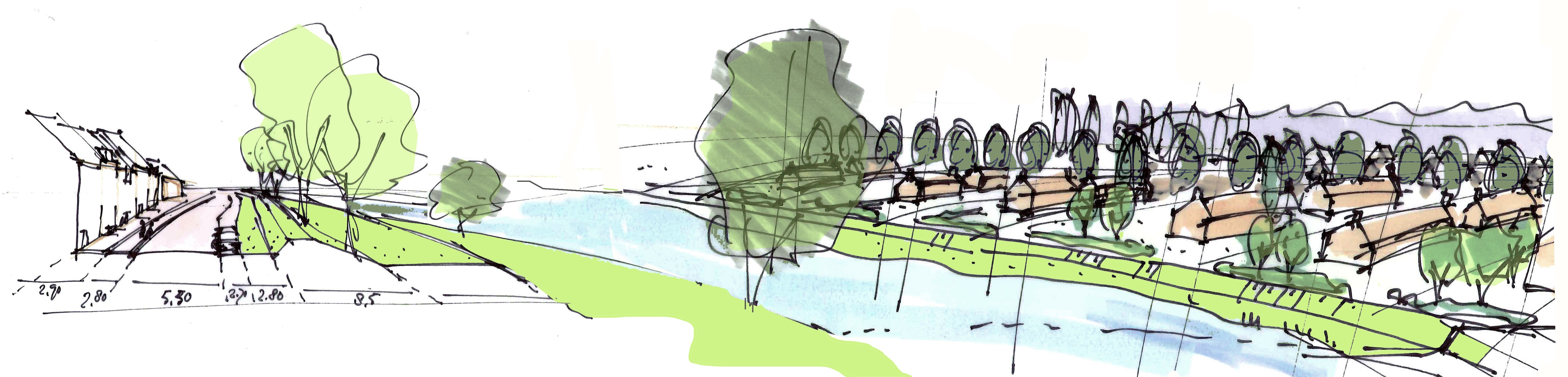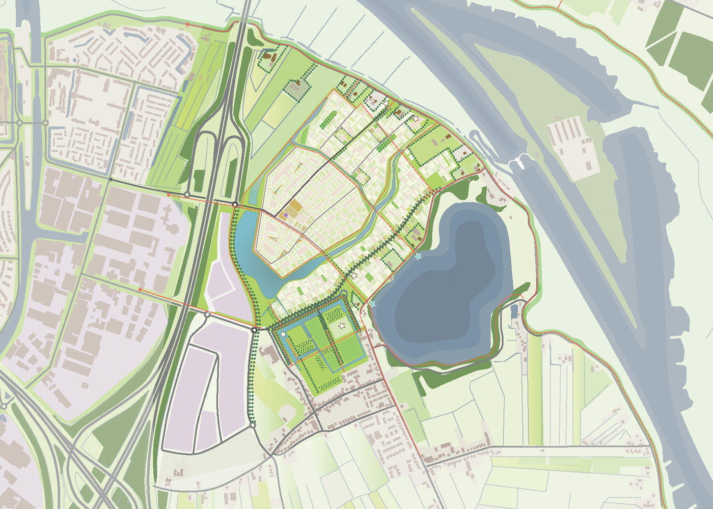 Er kan hier gebouwd worden door slim om te gaan ophoging, waterpeilen en klimaatbewust te ontwerpen. Een oude bocht van de rivier vormt de ruggengraat van het masterplan; de Meander. Binnen de meander woon je hoog en droog in het dorpshart. De meander maakt deel uit van een dynamisch watersysteem met flexibele peilhoogtes. Zo functioneert de Meander als waterberging en draagt hij bij aan de waterveiligheid in het gebied. Een extra bonus is dat er volop ruimte is voor biodiversiteit en recreatie langs de overs. In de winter schaatsen bewoners op de Meander, in de zomer genieten ze van de groene oevers.