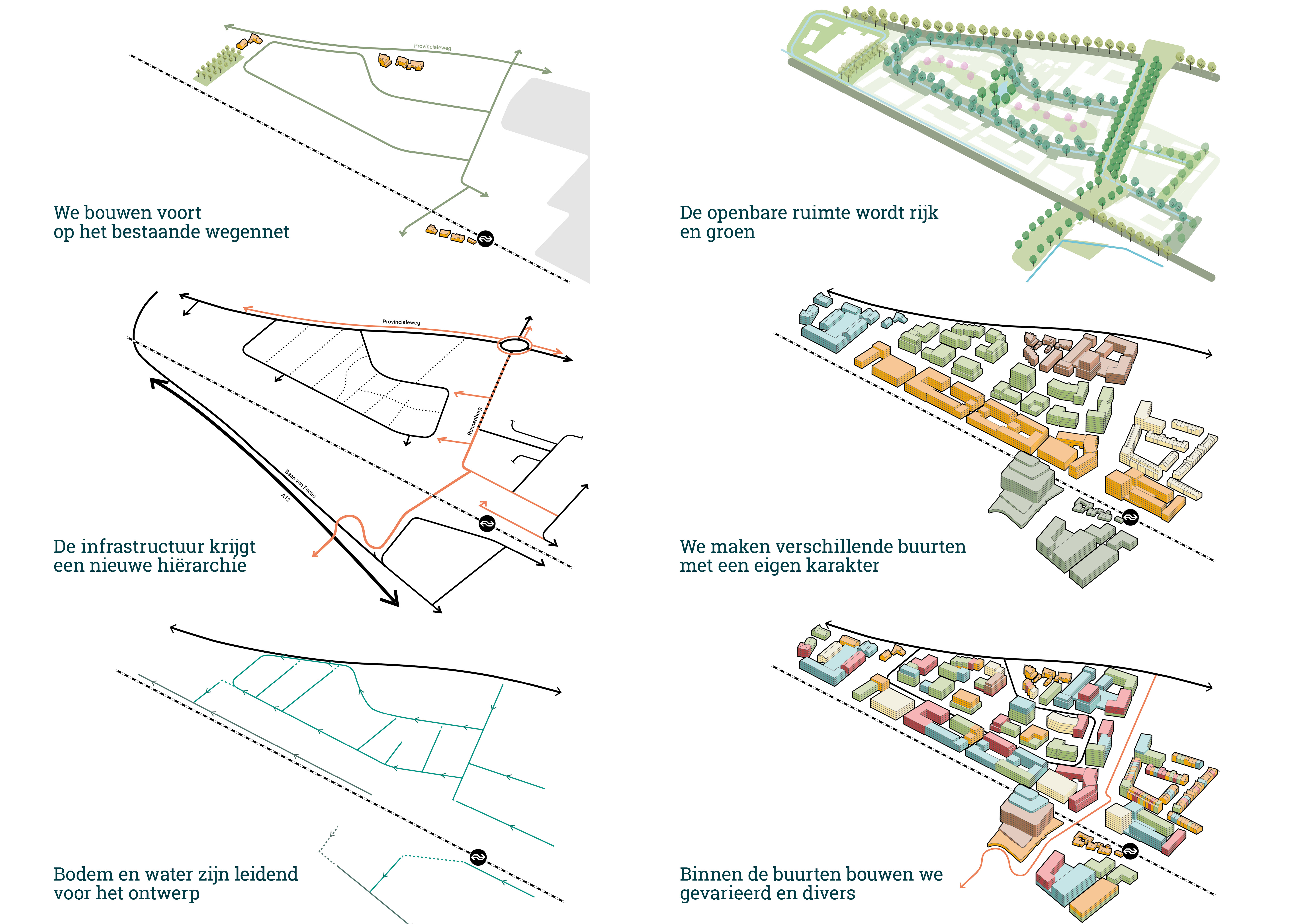 We bouwen voort op het bestaande wegennet en geven de infrastructuur een nieuwe hiërarchie, waarbij de verbindingen logischer en efficiënter worden. Bodem en water spelen een bepalende rol in het ontwerp, zodat het landschap optimaal benut wordt. De openbare ruimte wordt groen en rijk, met veel aandacht voor natuur en duurzaamheid. Binnen het raamwerk liggen verschillende buurten, ieder met een eigen karakter, die een gevoel van identiteit en verbondenheid bieden. Binnen deze buurten zorgen we voor gevarieerde en diverse woningtypen, waardoor er ruimte is voor verschillende leeftijden, levensstijlen en woonbehoeften.